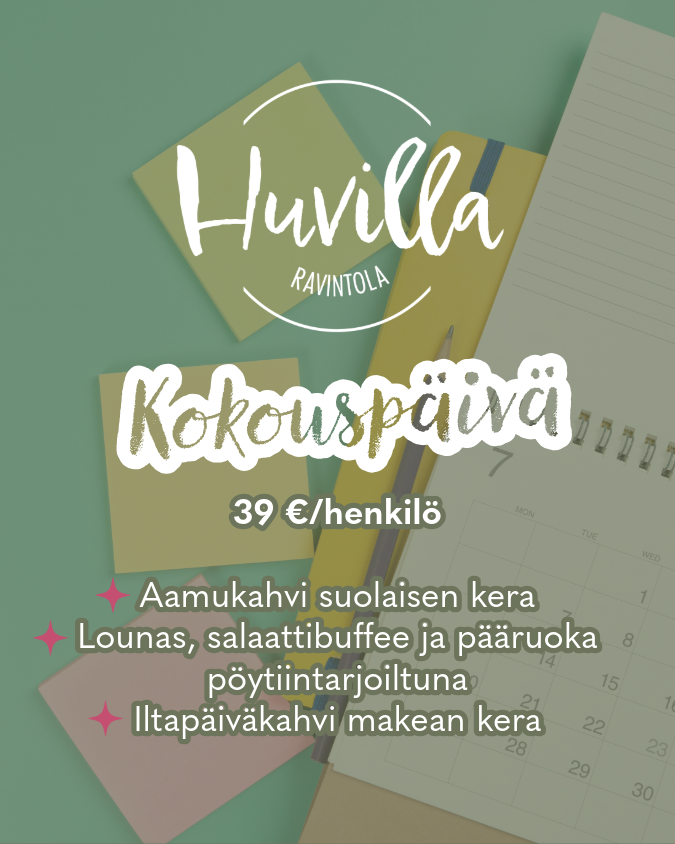 Ravintolastamme löytyy kokouksia varten videoprojektori sekä valkokangas. Lisäksi tilassa on langaton internetyhteys. Myös äänentoisto löytyy tarvittaessa. Unohtamatta tietenkään herkullisia kokoustarjoiluja!